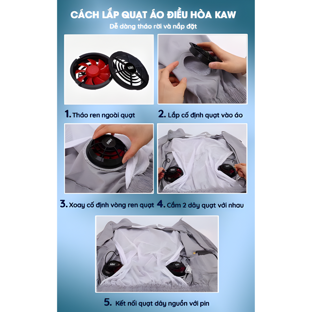 • Lắp quạt vào đúng vị trí thiết kế trên áo.