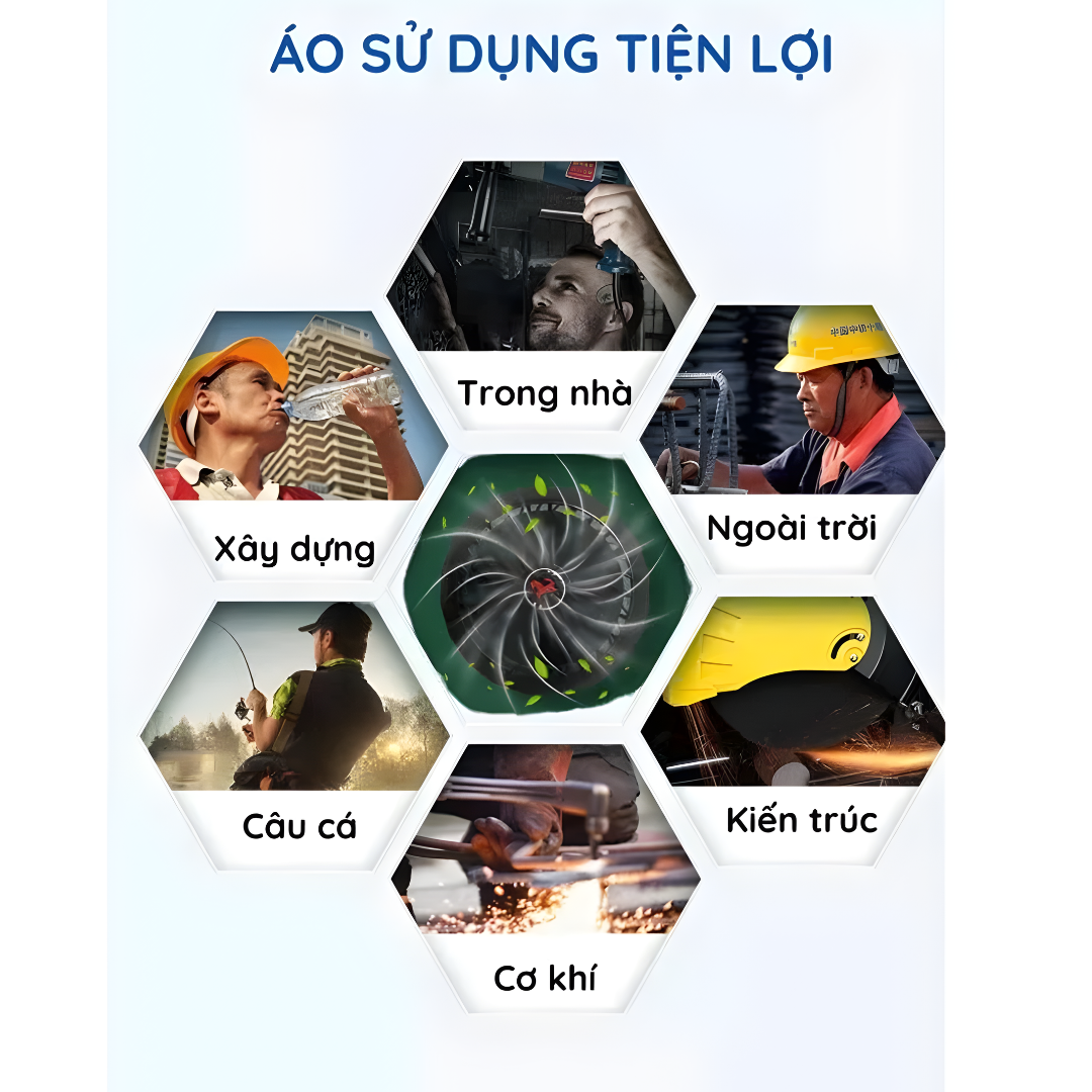 - Áo sử dụng công nghệ quạt kép giúp lưu thông không khí liên tục, tạo cảm giác mát mẻ tức thì.