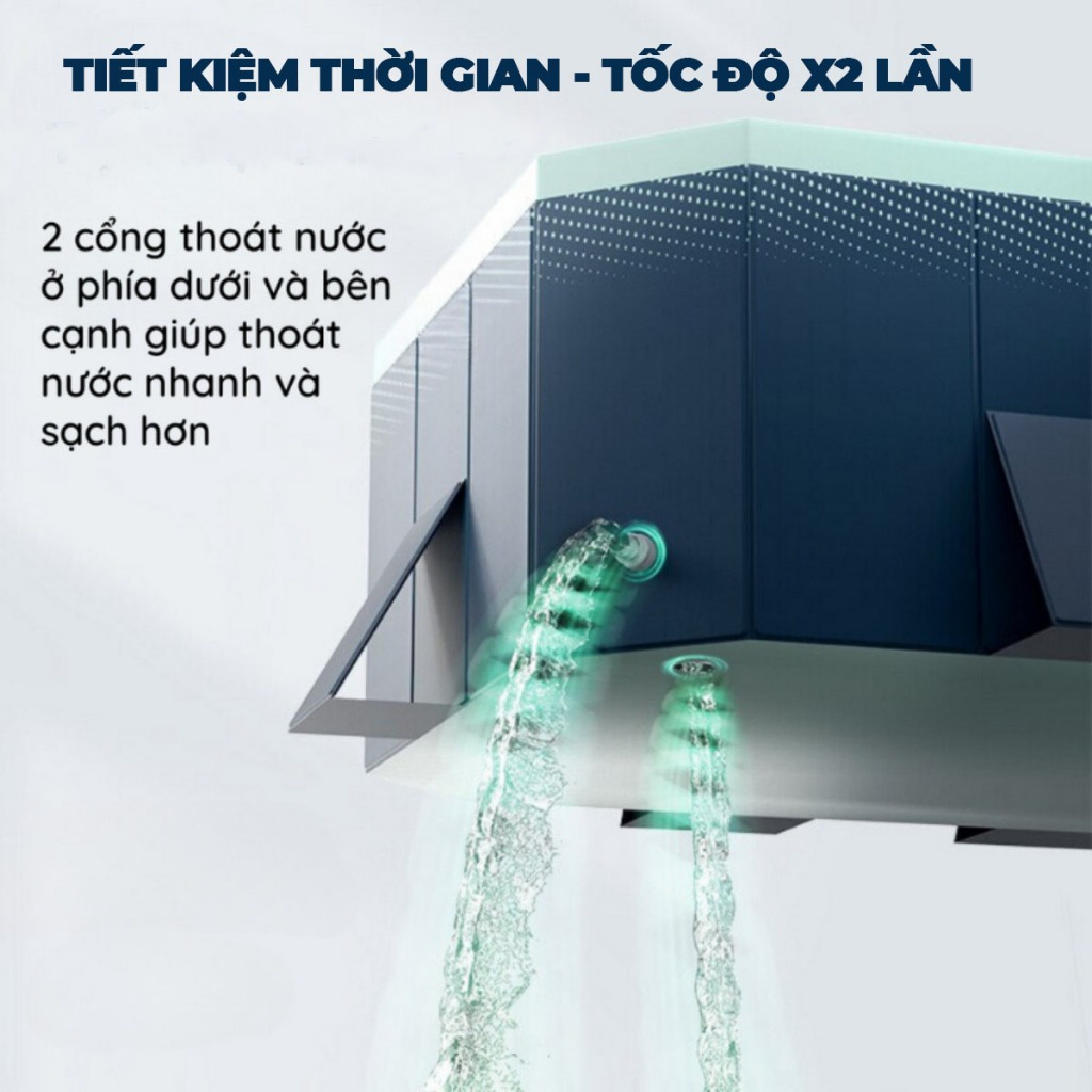 - Hệ thống thoát nước kép: 2 cổng xả bên hông và đáy giúp xả nhanh gấp đôi, không để đọng nước bẩn.