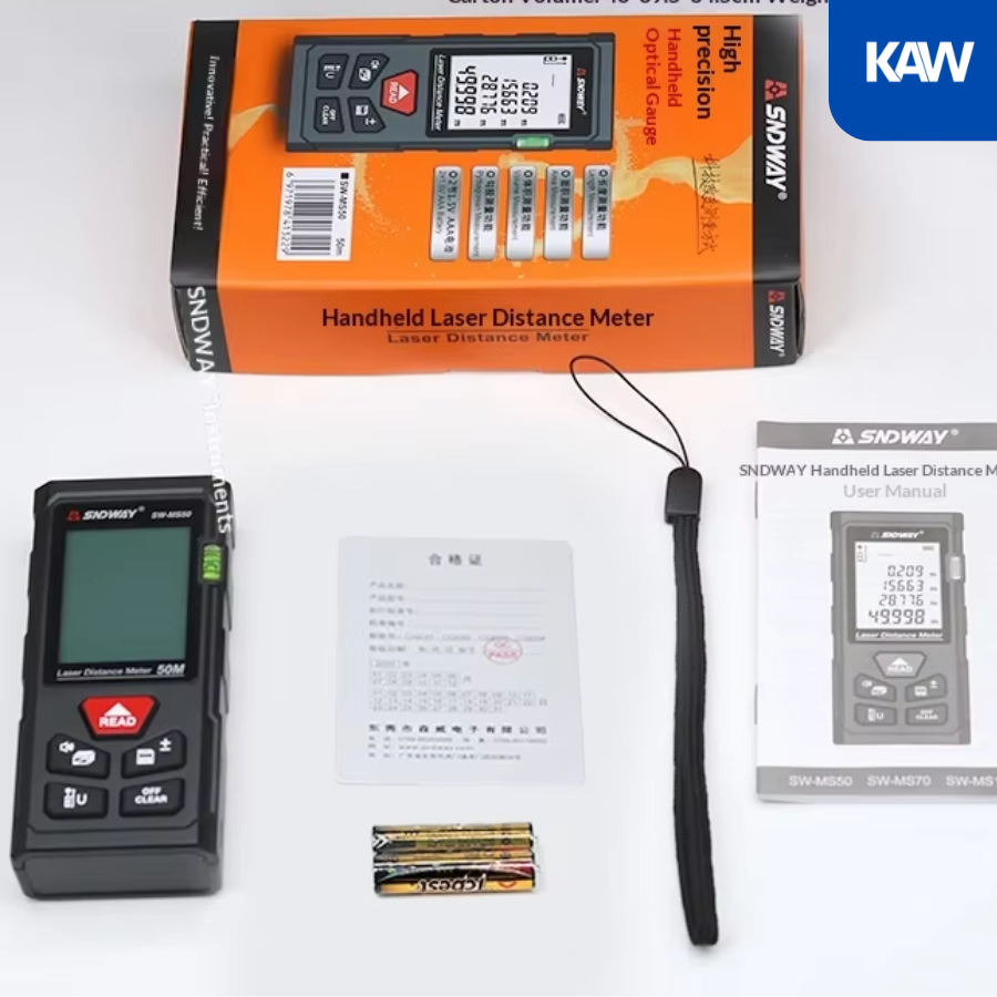 Thước đo khoảng cách bằng tia laser KAW SW-MS50 50m là thiết bị đo lường hiện đại, ứng dụng công nghệ laser tiên tiến giúp đo nhanh – chính xác – tiện lợi. Sản phẩm phù hợp cho kỹ sư xây dựng, thợ nội thất, đo đạc công trình, hoặc sử dụng trong gia đình. Với thiết kế nhỏ gọn, màn hình hiển thị rõ nét và khả năng đo đa chức năng, đây là lựa chọn tối ưu thay thế thước dây truyền thống.