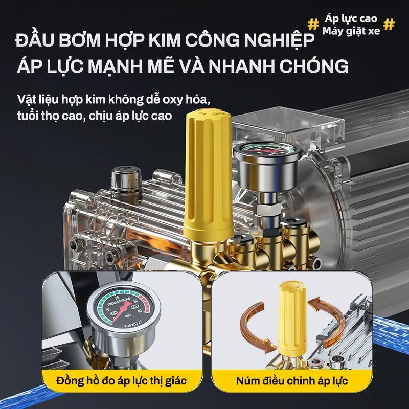 Sản phẩm sở hữu thiết kế cao cấp, lực phun mạnh, motor cảm ứng từ bền bỉ và khả năng vận hành ổn định. Đây là lựa chọn tối ưu cả cho gia đình và tiệm rửa xe nhỏ. Hình ảnh thực tế cho thấy máy có cấu trúc cao cấp, độ hoàn thiện tốt, hoạt động mạnh mẽ và hiệu quả lâu dài.