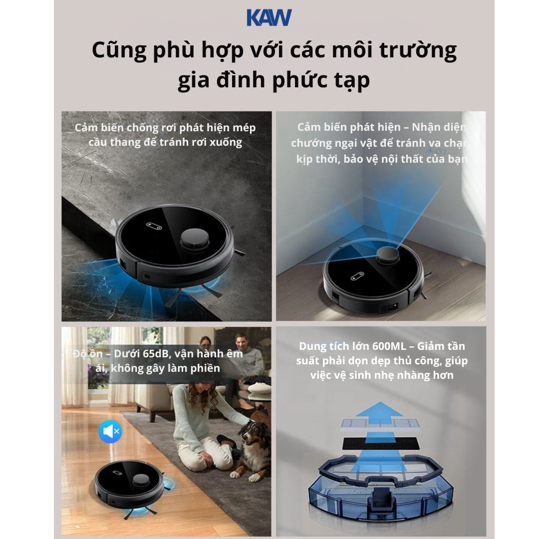 KAW 247D hỗ trợ hút và lau cùng lúc với hộp nước 350ml và hộp bụi 300ml, đáp ứng nhu cầu vệ sinh toàn diện. Robot trang bị động cơ không chổi than bền bỉ, hoạt động êm và tiết kiệm năng lượng. Đặc biệt, tính năng tự đổ rác vào trạm chứa giúp người dùng gần như không phải vệ sinh hằng ngày.
