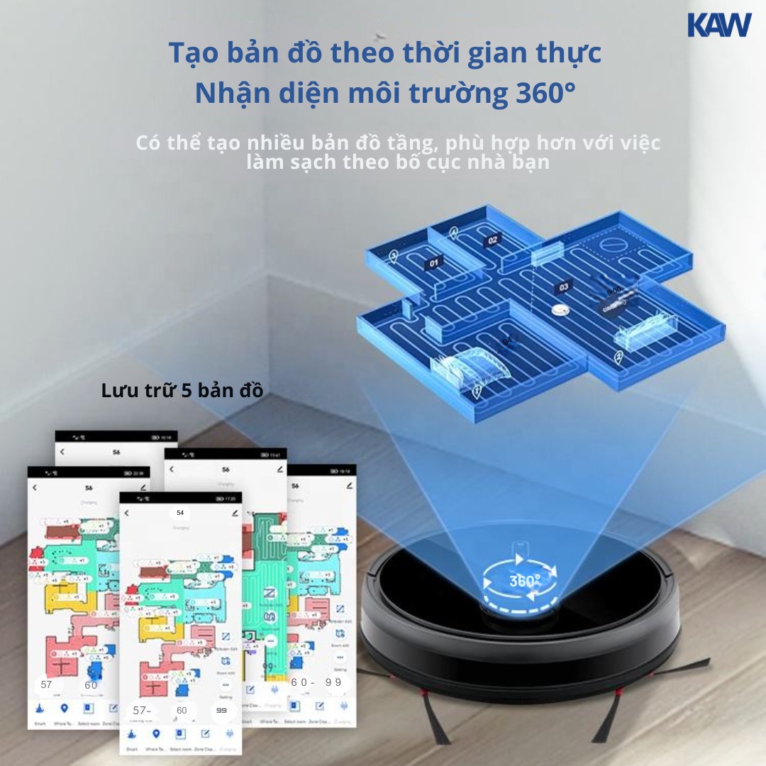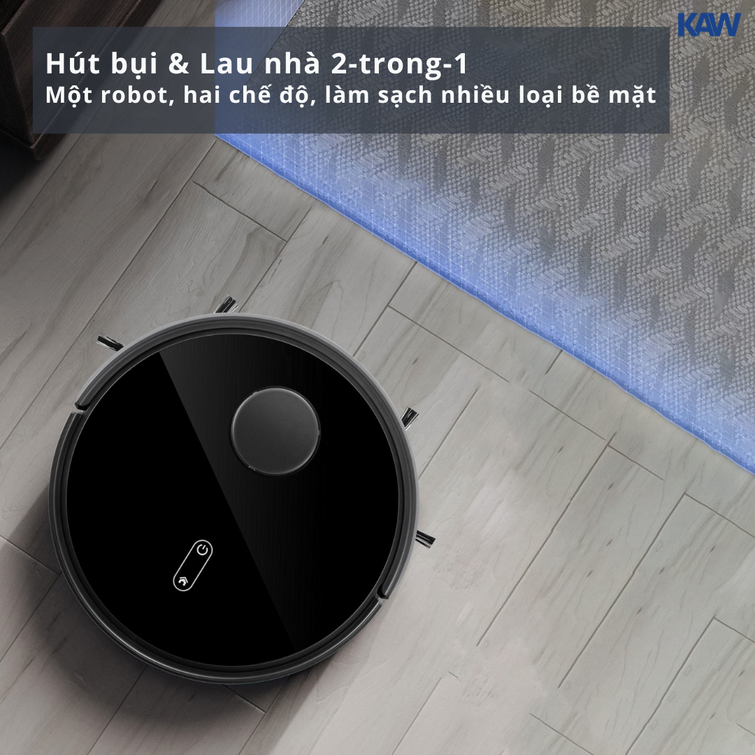 Robot hút bụi KAW 247D là dòng robot cao cấp ứng dụng công nghệ điều hướng LDS kết hợp SLAM, giúp lập bản đồ chính xác, di chuyển thông minh và làm sạch theo từng khu vực hiệu quả. Với lực hút mạnh 5000Pa, robot dễ dàng xử lý bụi mịn, tóc, lông thú và rác lớn trên nhiều loại sàn.
