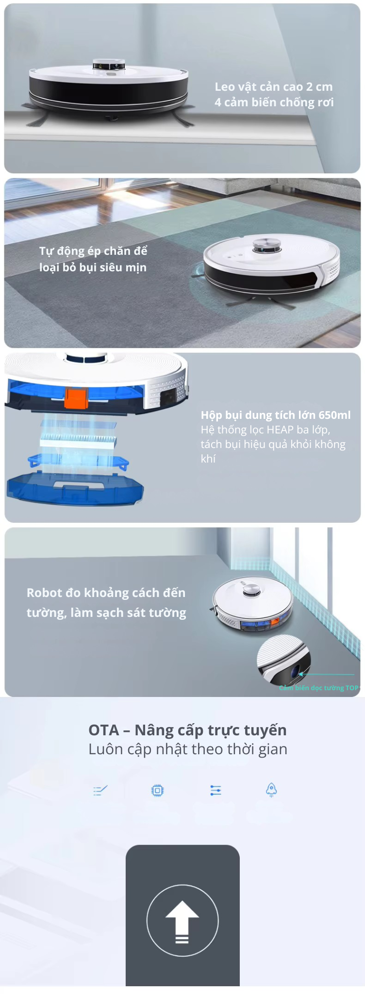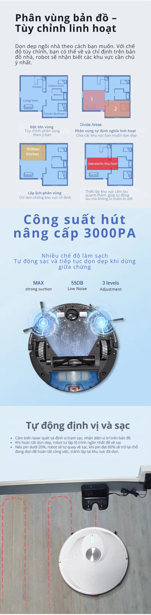 Robot hỗ trợ chế độ hút và lau ướt, trang bị bản đồ thông minh LDS Slam, giúp bạn theo dõi và thiết lập vùng cấm trên ứng dụng Tuya Smart hoặc Smart Life. Dung tích hộp bụi 650ml và bình nước 350ml, cùng pin 3000mAh, cho thời gian hoạt động liên tục 91–120 phút.