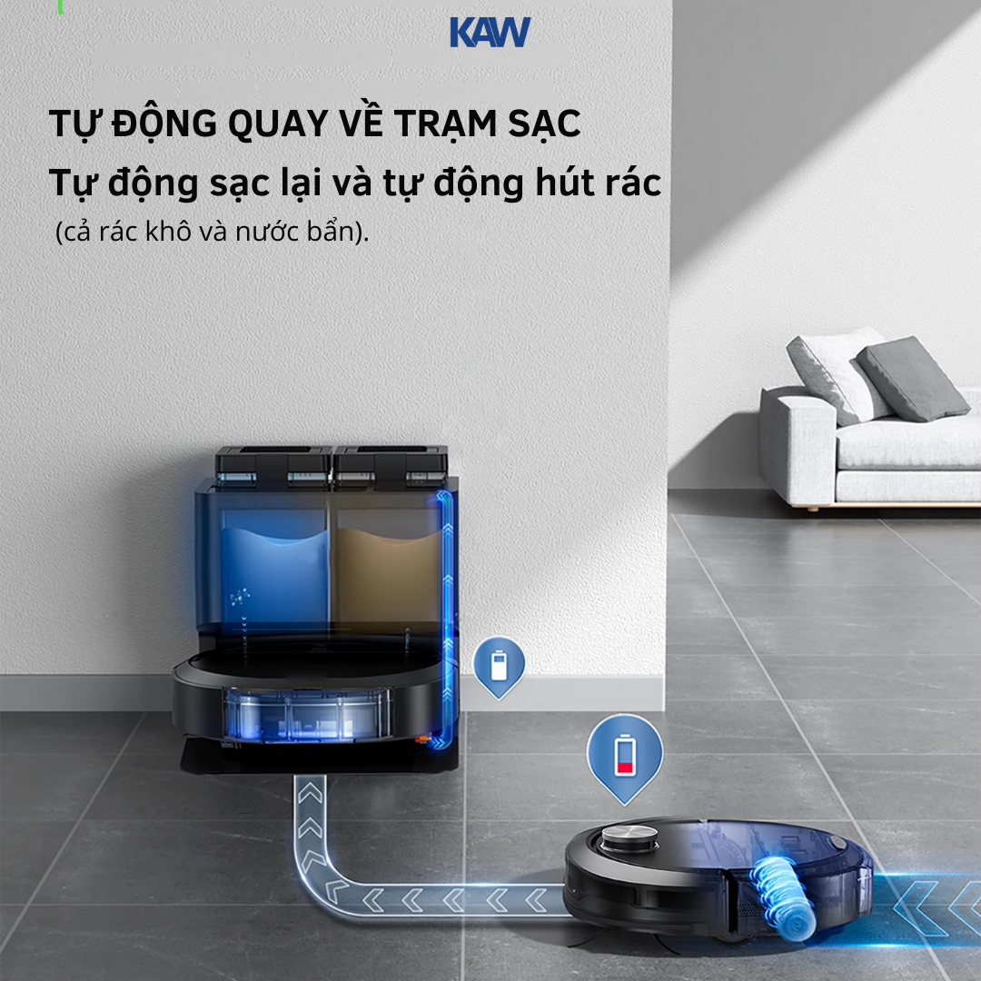 Robot hút bụi lau nhà KAW 249A là dòng thiết bị vệ sinh thông minh thế hệ mới, nổi bật với hệ thống lọc nước thải hiện đại giúp quá trình lau luôn sạch và không để lại vệt bẩn. Với lực hút mạnh 12000Pa, robot dễ dàng xử lý các loại bụi mịn, tóc, lông thú hay rác lớn chỉ trong một lần di chuyển.