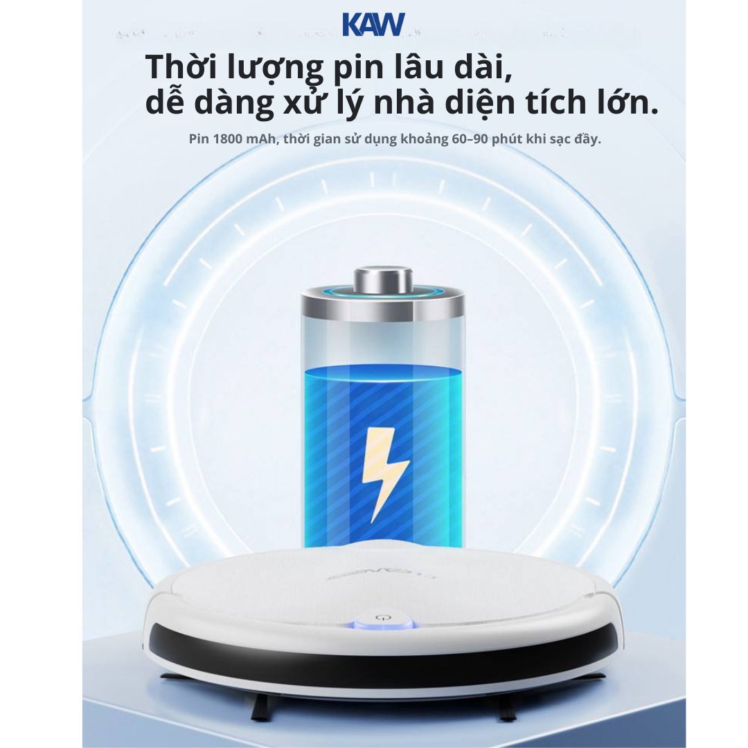 Sản phẩm được trang bị pin 1800mAh hoạt động liên tục 60–90 phút, kết hợp hộp nước hỗ trợ lau sàn. Thiết kế nhỏ gọn giúp robot dễ dàng di chuyển vào các khu vực như gầm giường, gầm sofa, đảm bảo làm sạch sâu và hiệu quả.