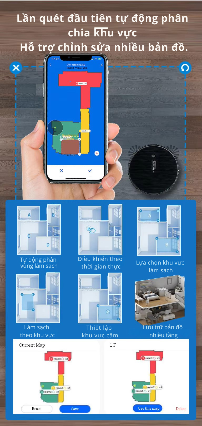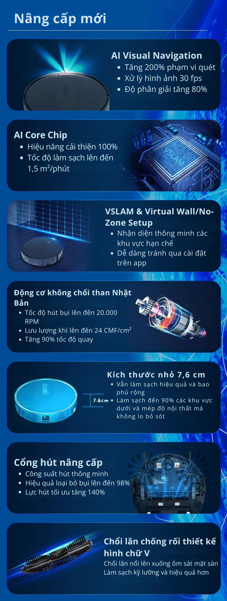 Điều hướng thông minh VSLAM: Lập bản đồ chính xác, lên kế hoạch dọn dẹp tối ưu.