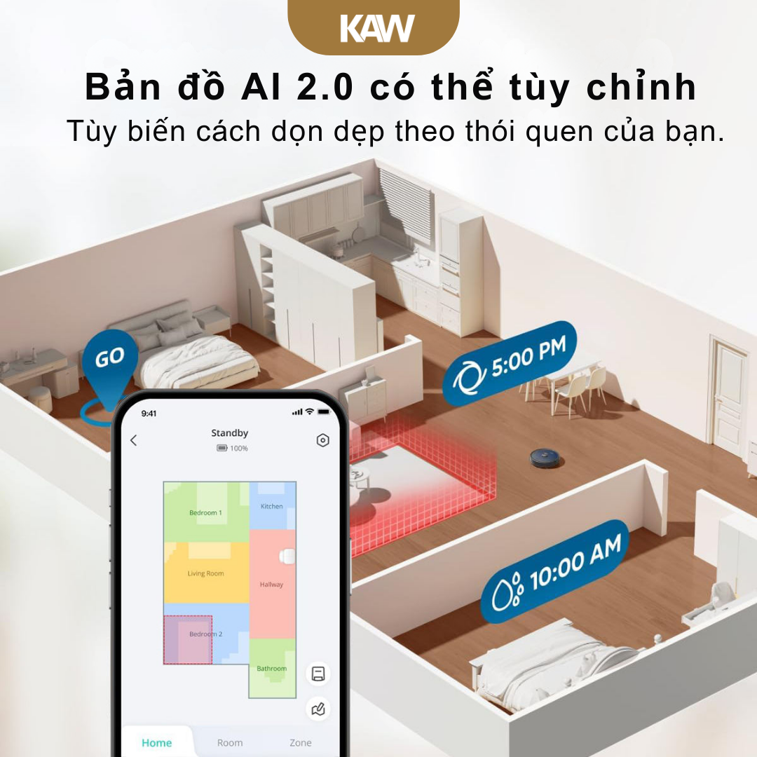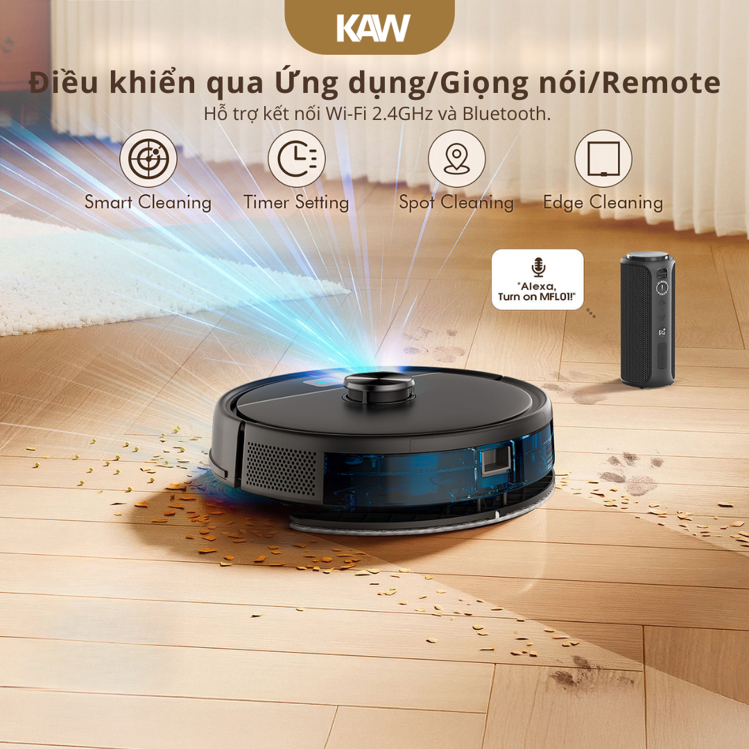 KAW 245A hoạt động ổn định với thời gian lên đến 150 phút, phù hợp dọn dẹp căn hộ, nhà phố hoặc văn phòng. Với khả năng điều khiển qua ứng dụng, kết nối WiFi 2.4GHz và Bluetooth, robot mang đến trải nghiệm làm sạch tự động, thông minh và dễ sử dụng.