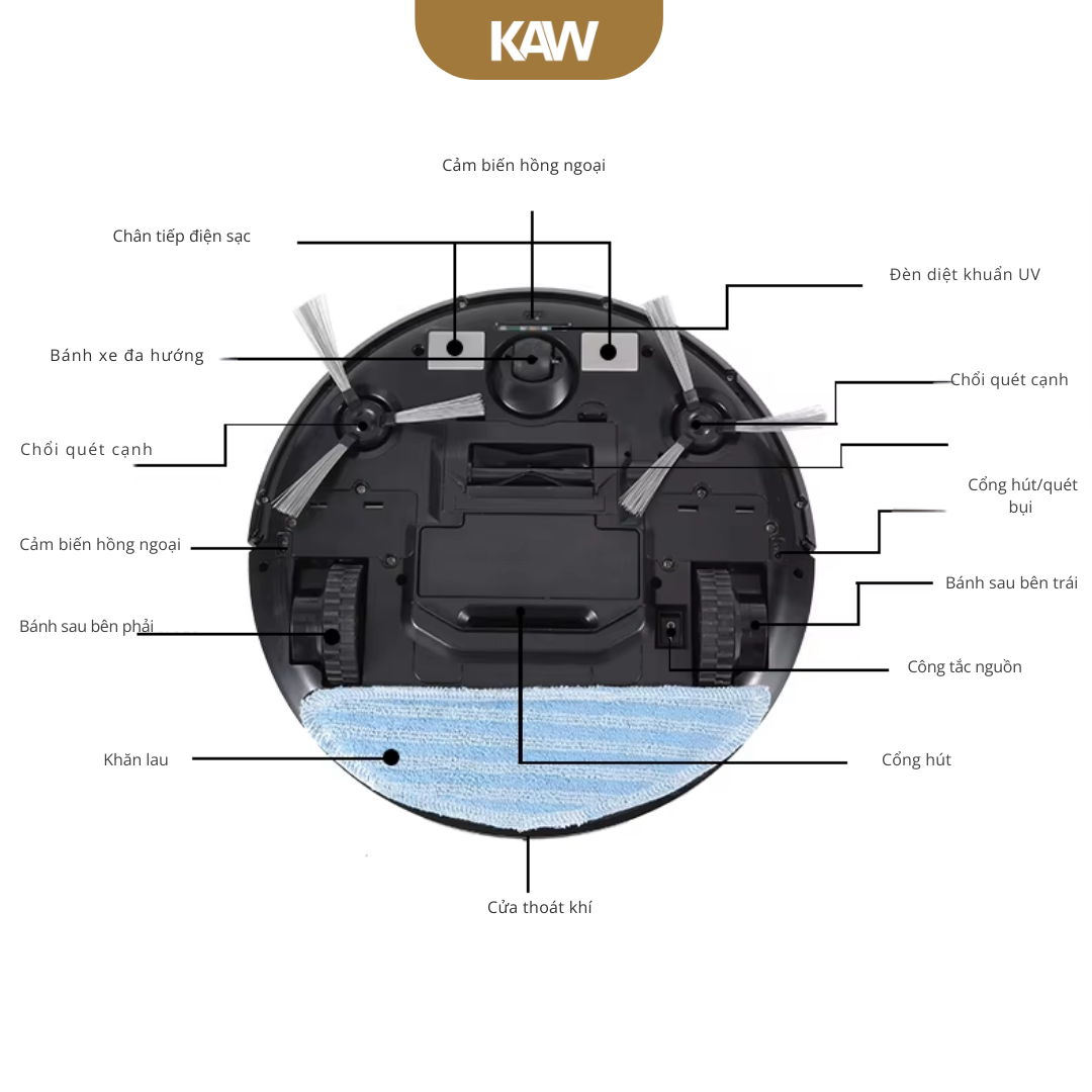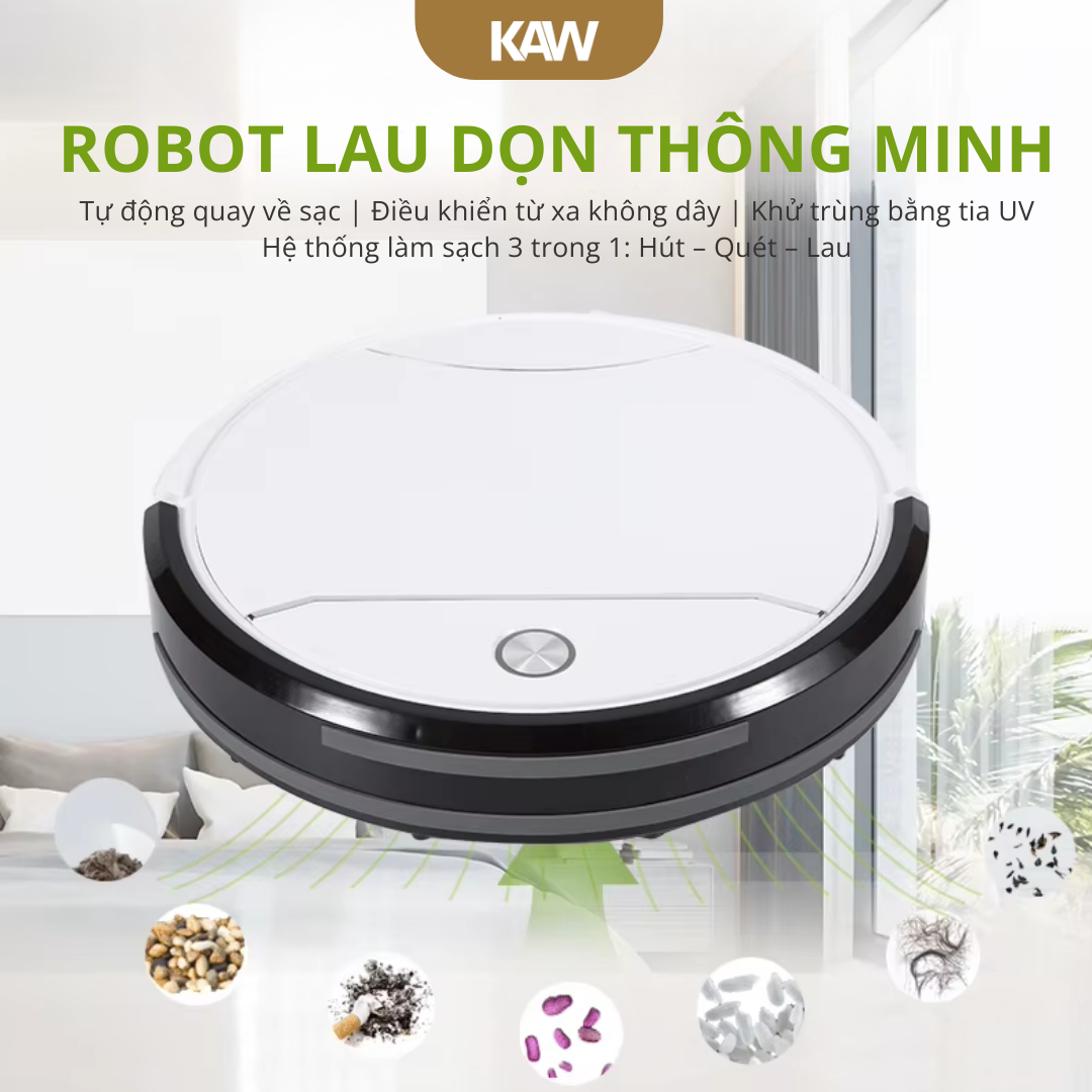 Robot Hút Bụi Tự Sạc KAW 245C – Hút Quét Lau 3 Trong 1, Diệt Khuẩn UV, Điều Khiển Từ Xa